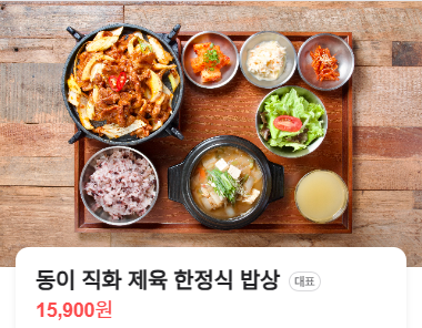 ● 동이직화제육한정식밥상: 냉장육을 고온에서 빠르게 요리해 채소의 식감과 육즙을 살린 불맛 가득 대표 메뉴